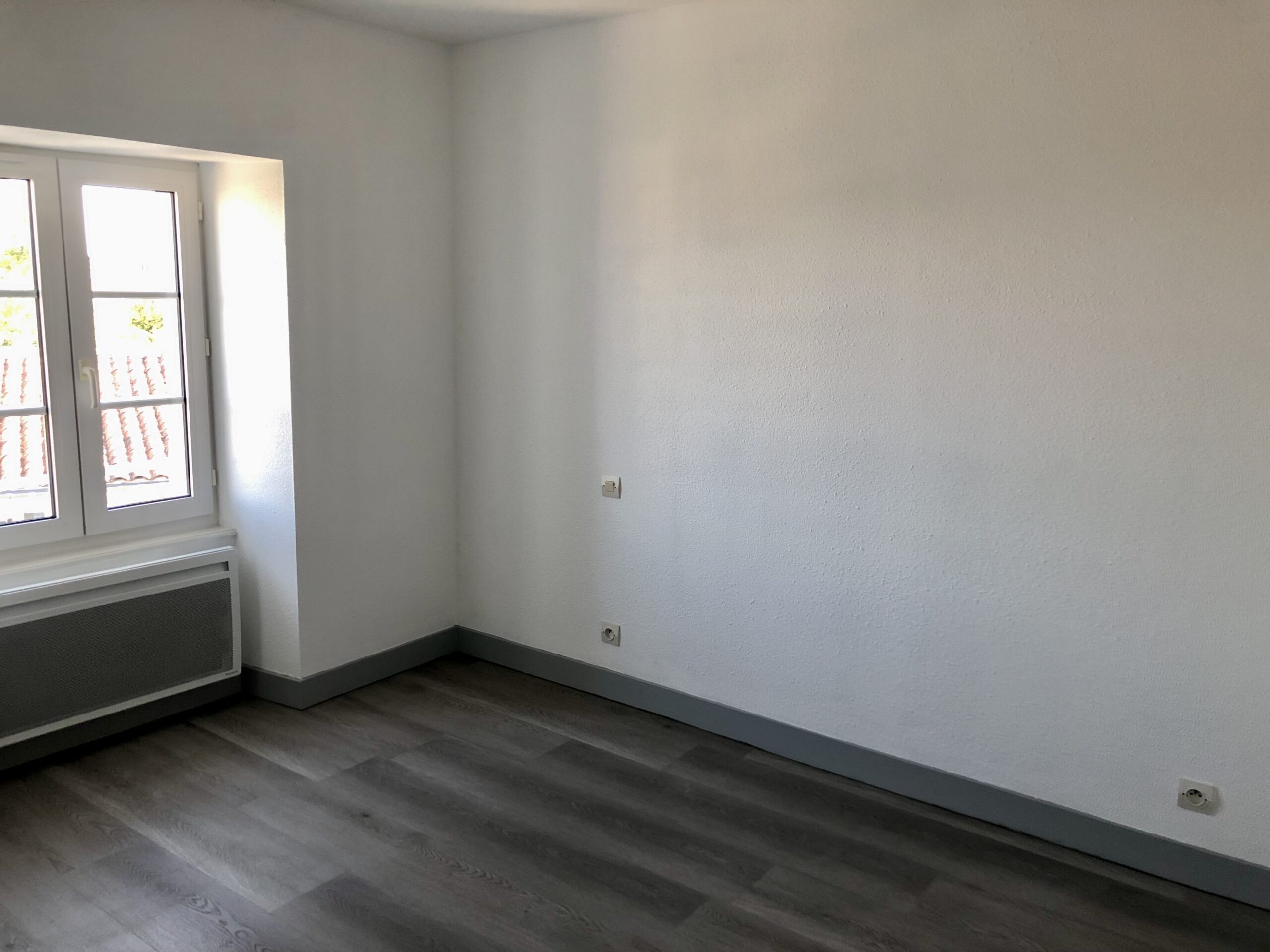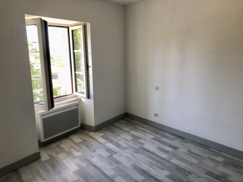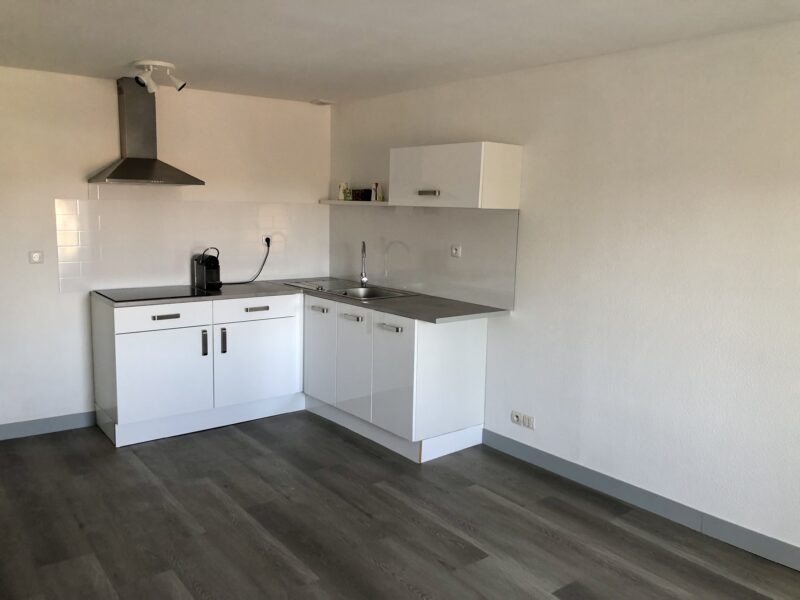 Entrée, séjour/salon avec cuisine ouverte aménagée et équipée (plaques, hotte, placards), deux chambres dont une avec placard et salle d’eau avec WC.