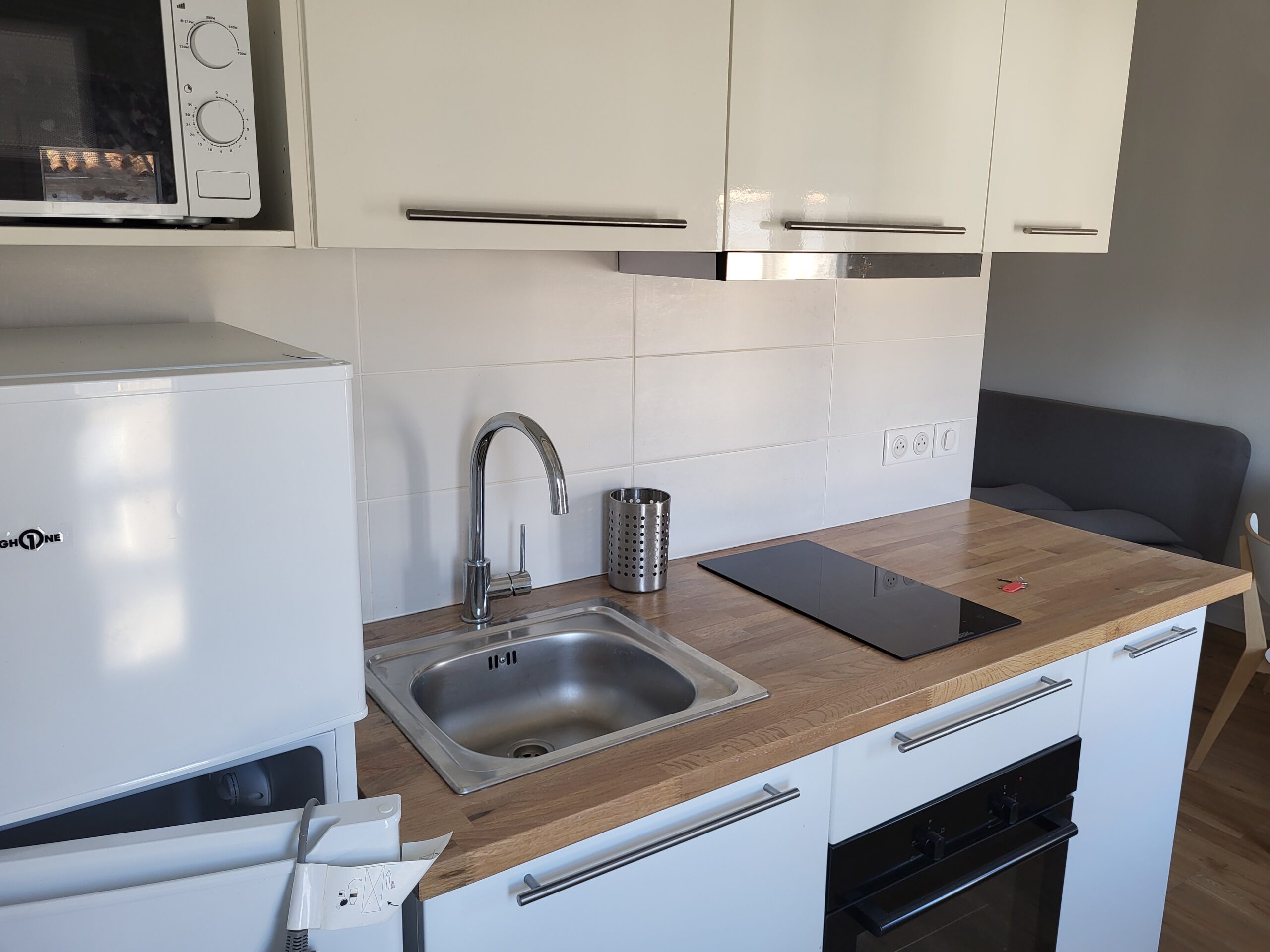 Entrée, wc avec lave-mains, pièce de vie avec coin cuisine ouverte équipée (plaque, hotte, four, réfrigérateur, lave-linge, nombreux placards),