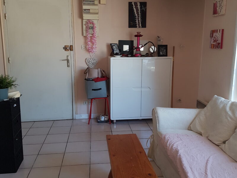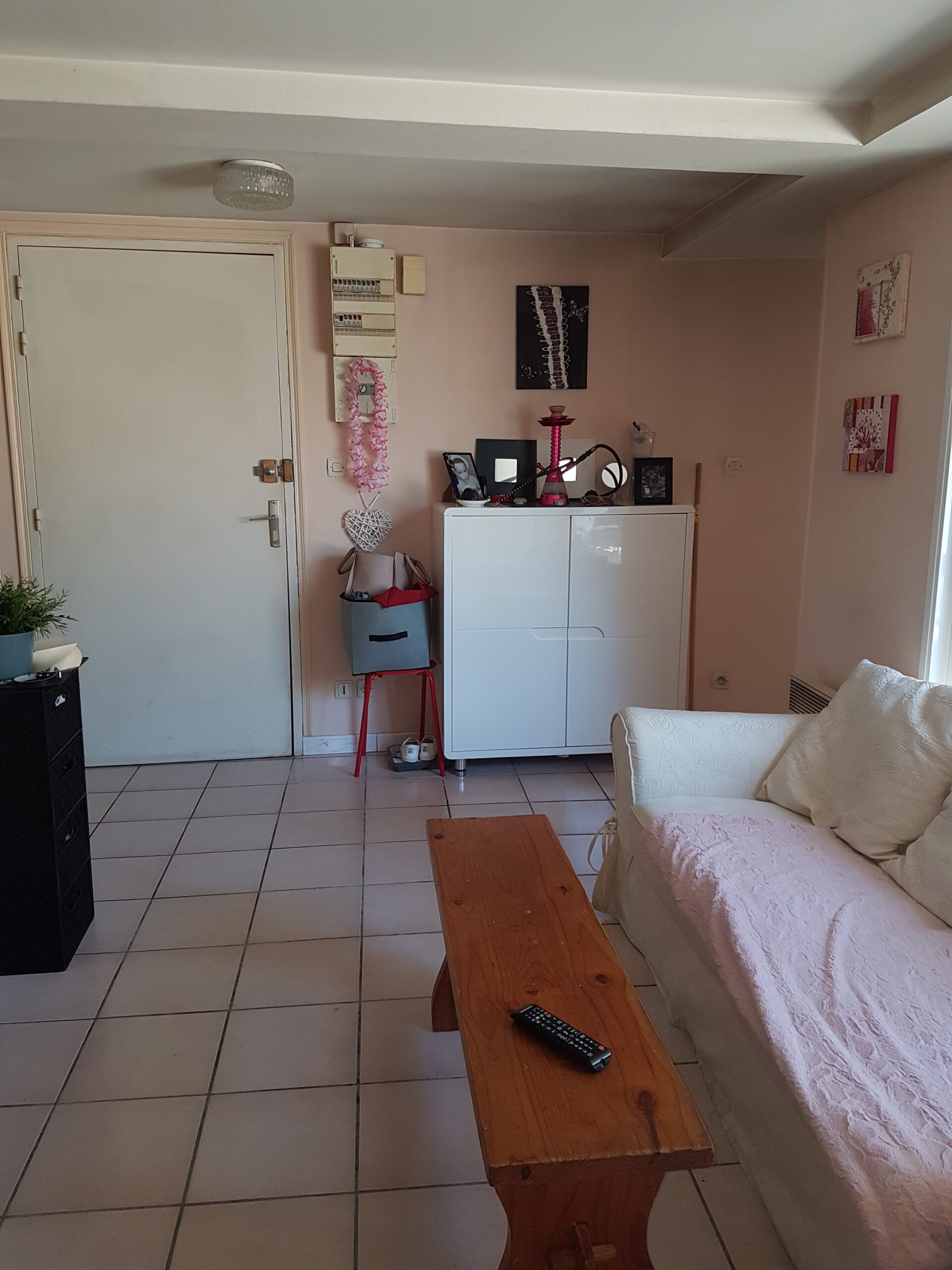 Entrée sur séjour/salon avec coin cuisine ouverte aménagée et équipée (réfrigérateur, plaques), un espace chambre, une salle de bains, WC.