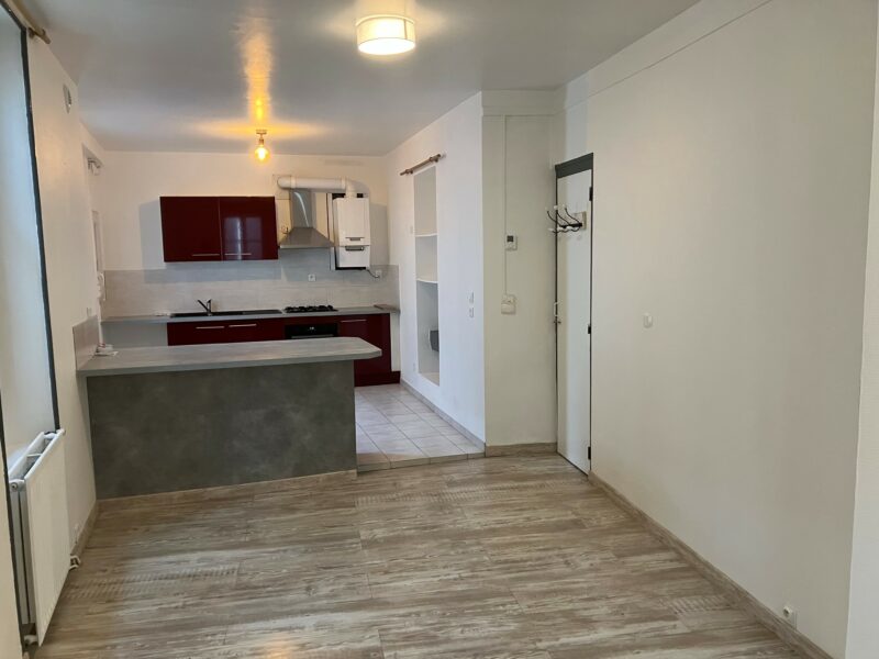 Entrée sur séjour/salon, cuisine aménagée et équipée (plaques et hotte), coin buanderie, WC,