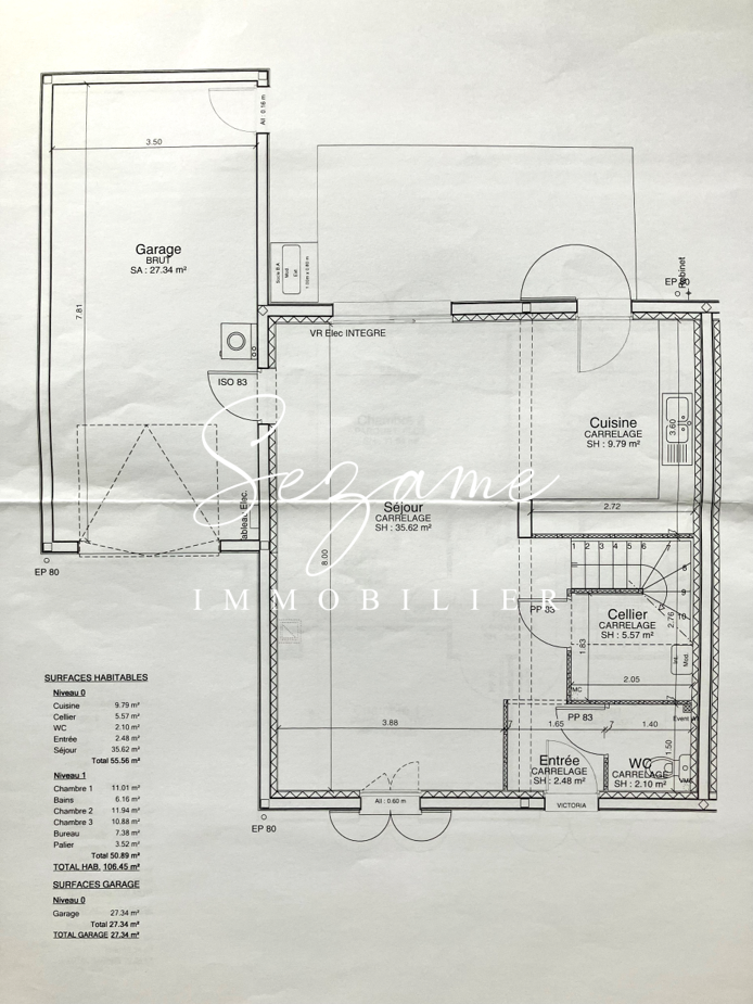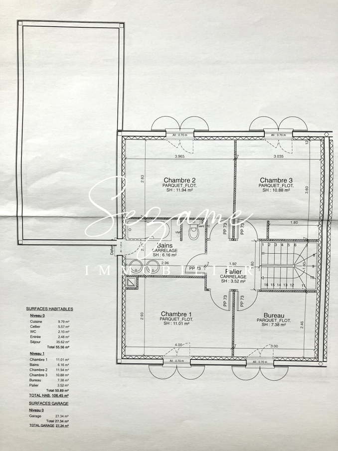 D’une surface de 106 m², elle se compose ainsi : Au rez-de-chaussée : Entrée (2.5 m²), Belle pièce de vie avec séjour/salon (36 m²),