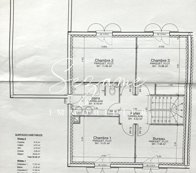 A l’étage : Palier desservant trois chambres (11, 11 et 12 m²), grands placards dressing intégrés et un bureau (7.5 m²)
