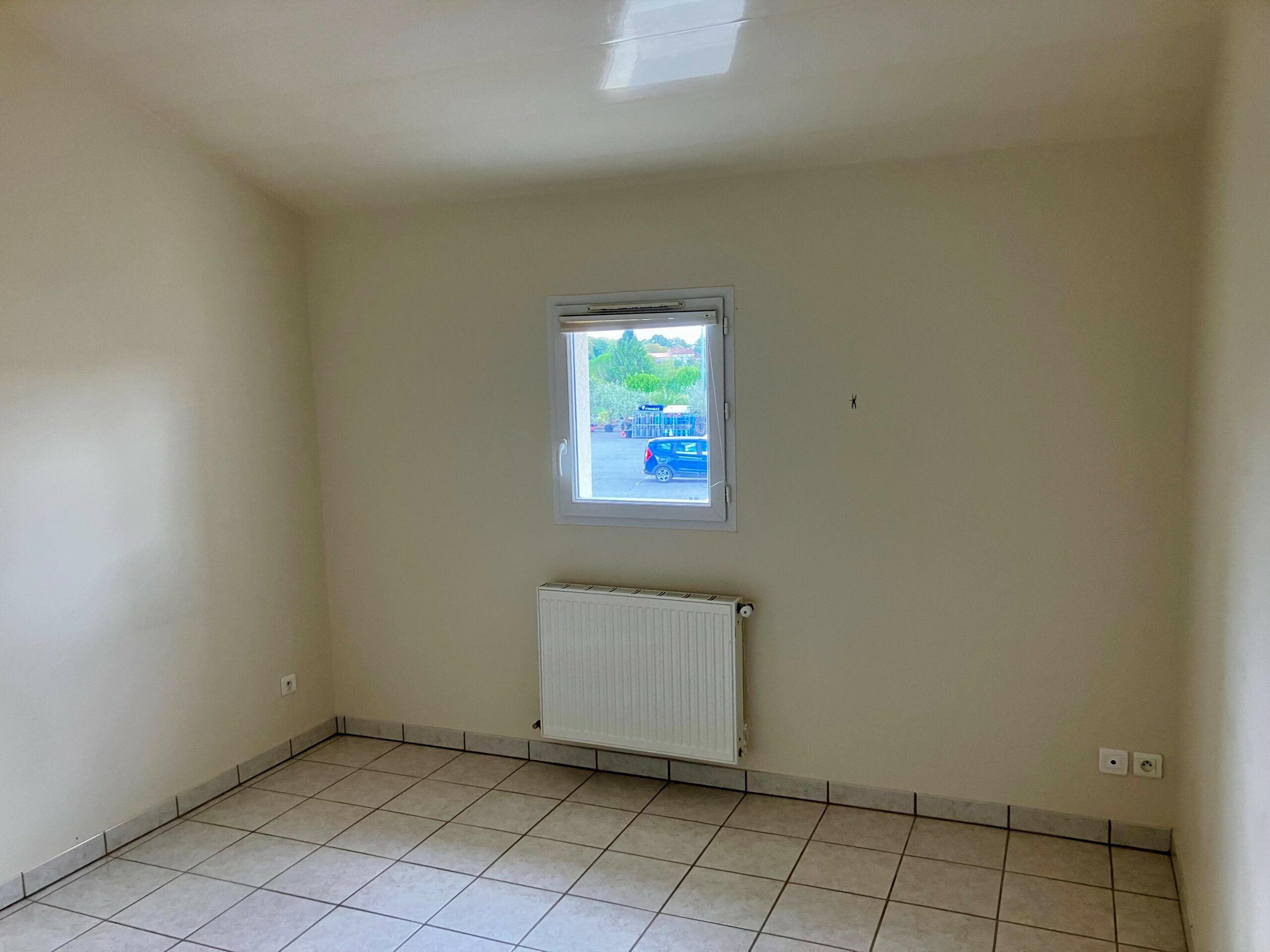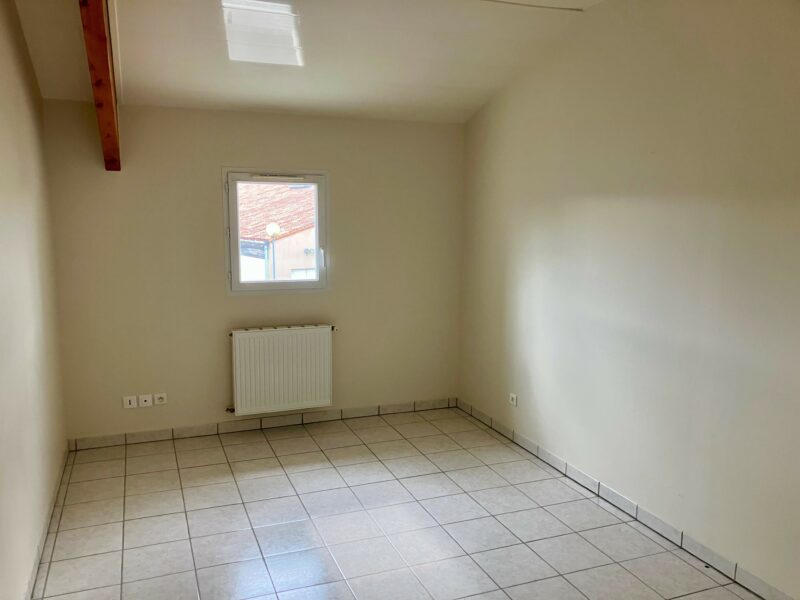 Entrée, WC, séjour/salon avec cuisine ouverte aménagée et équipée (hotte et plaques), deux chambres et une salle d’eau.